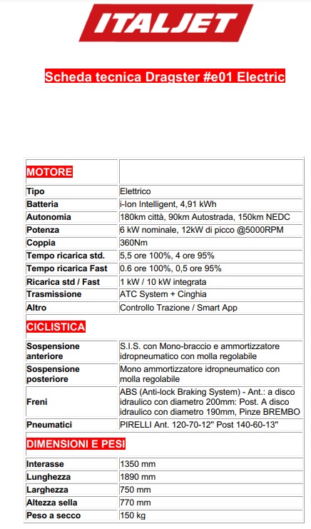 NUOVO ITALJET DRAGSTER e01 Electric 2023 scheda tecnica