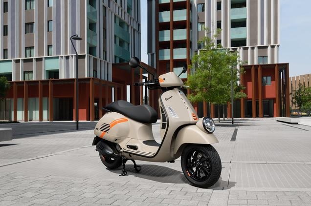 La nuova Vespa Gtv è disponibile nelle due colorazioni Beige Avvolgente Opaco e Nero Convinto, con grafica arancione a contrasto sul cupolino e sulle fiancate.