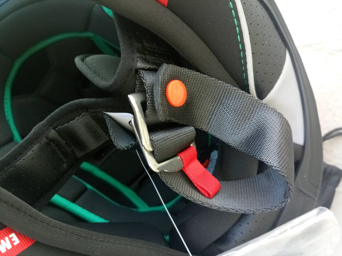 Sistema di Ritenzione: A doppia D con imbottitura soft-touch. Il sistema di chiusura a doppia D è considerato il più sicuro e affidabile per i caschi da moto, in quanto garantisce una chiusura precisa e impedisce lo sganciamento accidentale. L'aggiunta di un'imbottitura soft-touch mira a migliorare il comfort nella zona del collo.