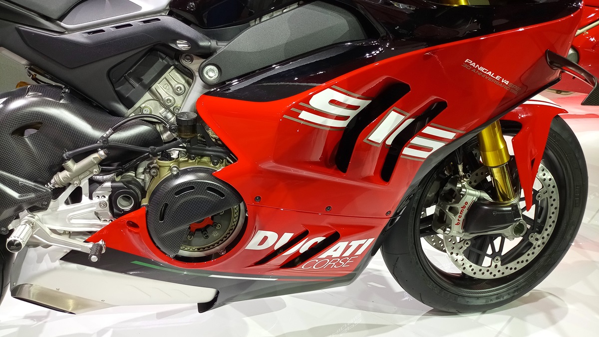 L’equipaggiamento tecnico unisce le specifiche SP2 a una serie di dettagli di grande pregio, che rendono ancora più unica questa moto. La Panigale V4 SP2 30° Anniversario 916 ha infatti il tappo per serbatoio racing in alluminio lavorato dal pieno*, i condotti dell’aria per il raffreddamento dei freni anteriori, il paracalore dello scarico, le ali con disegno a doppio profilo e il parafango anteriore in fibra di carbonio.
