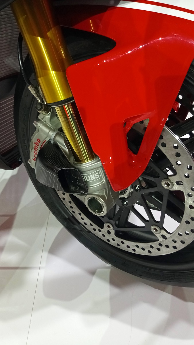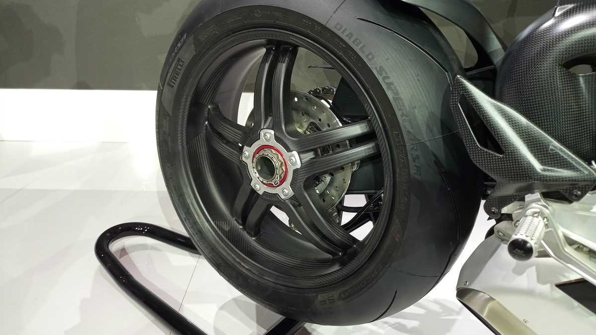 In fibra di carbonio sono anche i cerchi a cinque razze sdoppiate, che riducono il peso delle ruote di 1,4 kg rispetto ai Marchesini forgiati della V4 S e di 3,4 rispetto a quelli della Panigale V4. Il momento inerziale si riduce di circa il 26% sull’anteriore e del 46% sul posteriore, rendendo la moto più agile, meno faticosa e più precisa in accelerazione.
